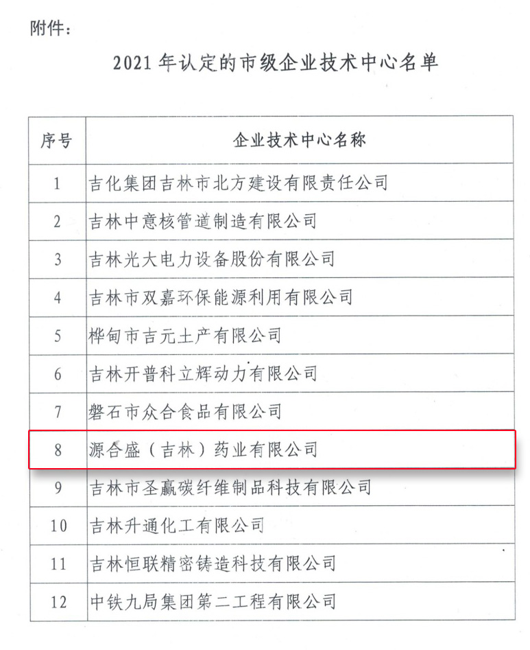 根据《吉林市市级企业技术中心认定管理办法》规定,按照《吉林市工业和信息化局关于组织申报2021年度市级企业技术中心的通知》(吉市工信发[2021]40号的有关要求,经县(市)区推荐、材料初审、实地核查和专家评审等环节,源合盛(吉林)药业有限公司成功认定为2021年市级企业技术中心。