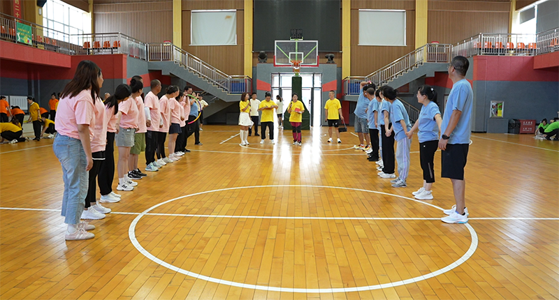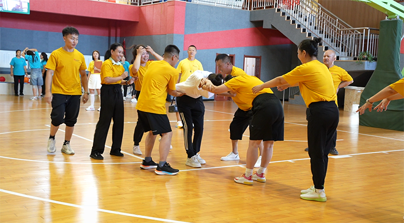 合力运气球环节成为赛事亮点。各队需用身体抵住气球,与前面队友合力将气球运送到终点,全程双手不触碰气球,考验每个成员的默契和速度。一圈到底项目中,呼啦圈从第一名队员开始,绕过每一个队员的身体,传递到队尾,全程不松开双手,通过比赛大家明白这就是团队的意义。
